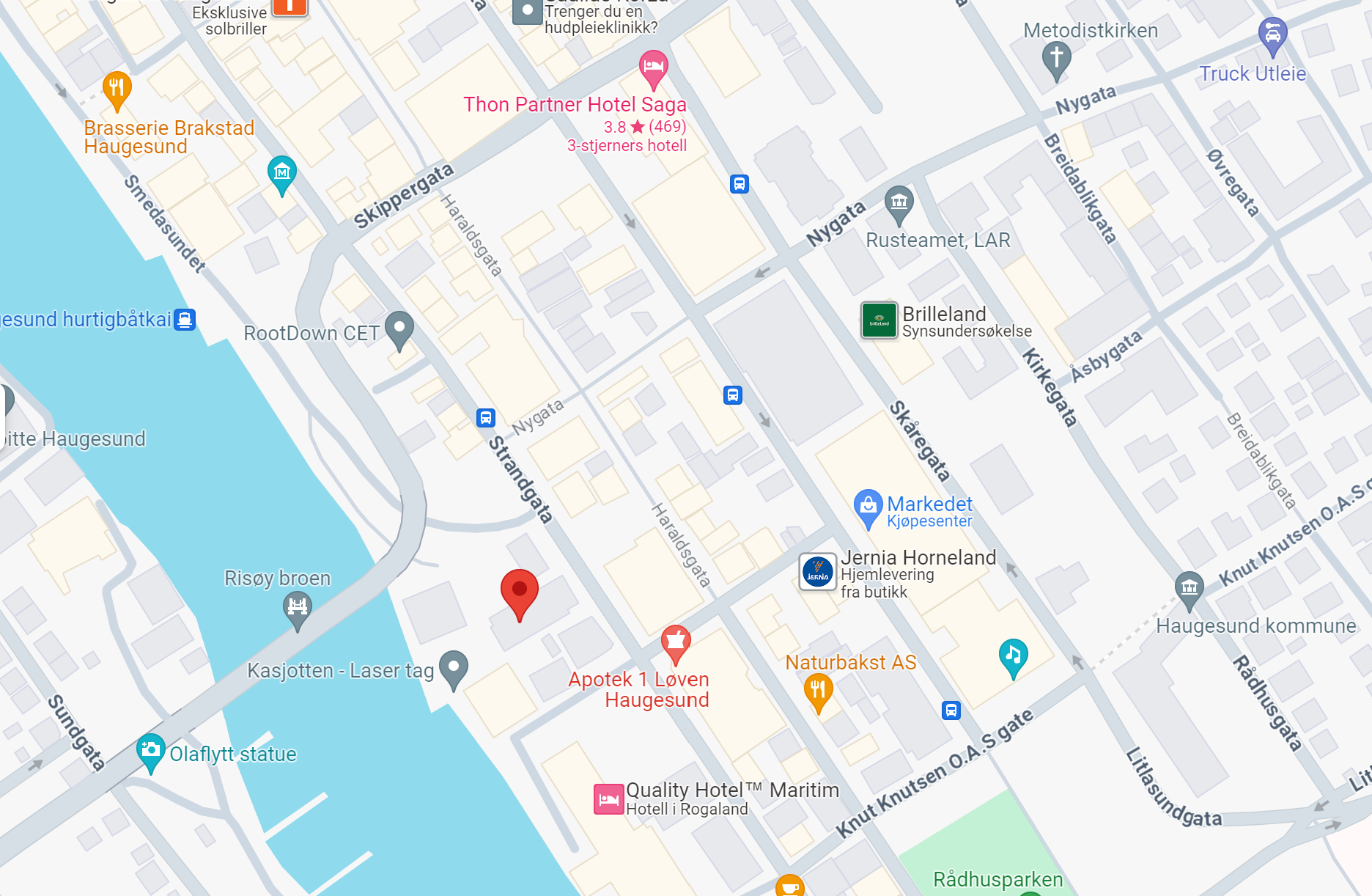 Jeg holder til i Strandgata 94, 5528 Haugesund, i første etasje.